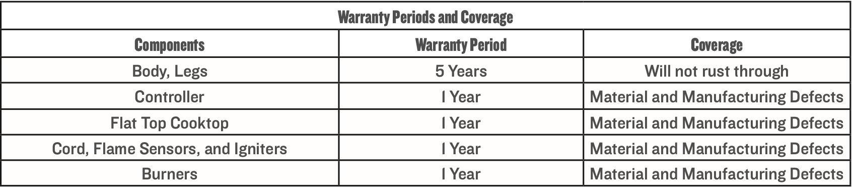 Traeger Pellet Grills LLC warrants this Traeger® Flat Top Grill or the components, coverage, and warranty period listed in the table below under normal use and proper maintenance. This warranty gives you specific legal rights, and you may also have other rights which may vary among states and provinces. The warranty period starts from the date of original purchase from traeger.com or a Traeger authorized dealer. A list of Traeger authorized dealers is available at https://www.traeger.com/dealers (together each an “Authorized Seller”). The warranty period and coverage
